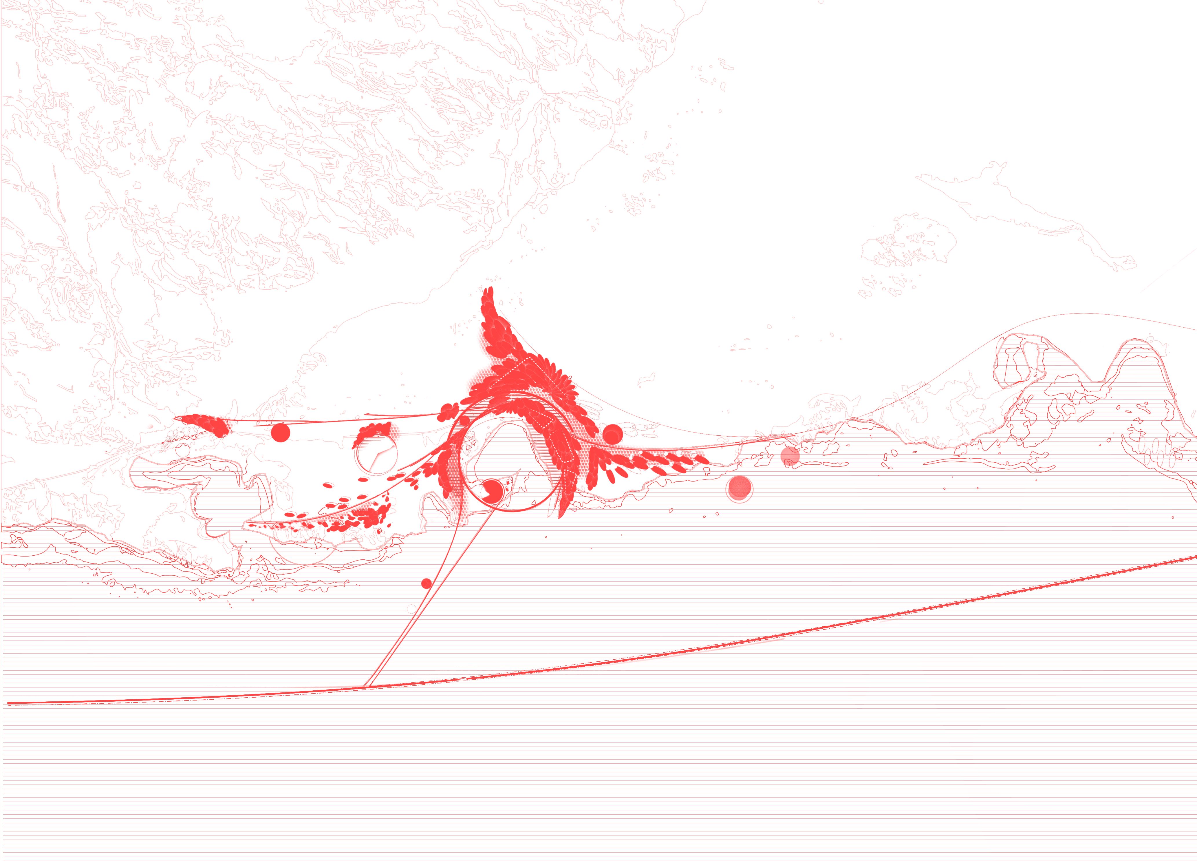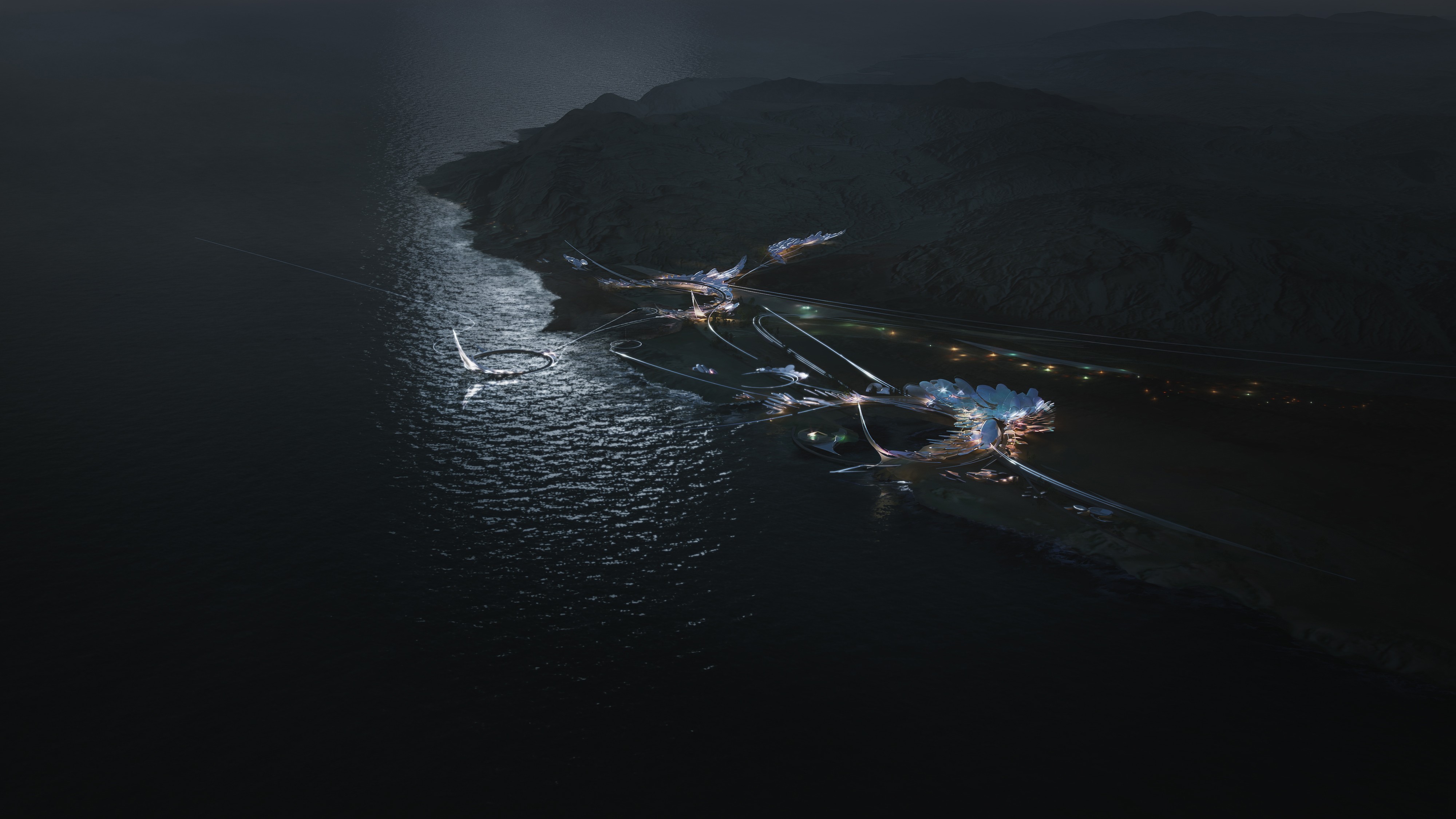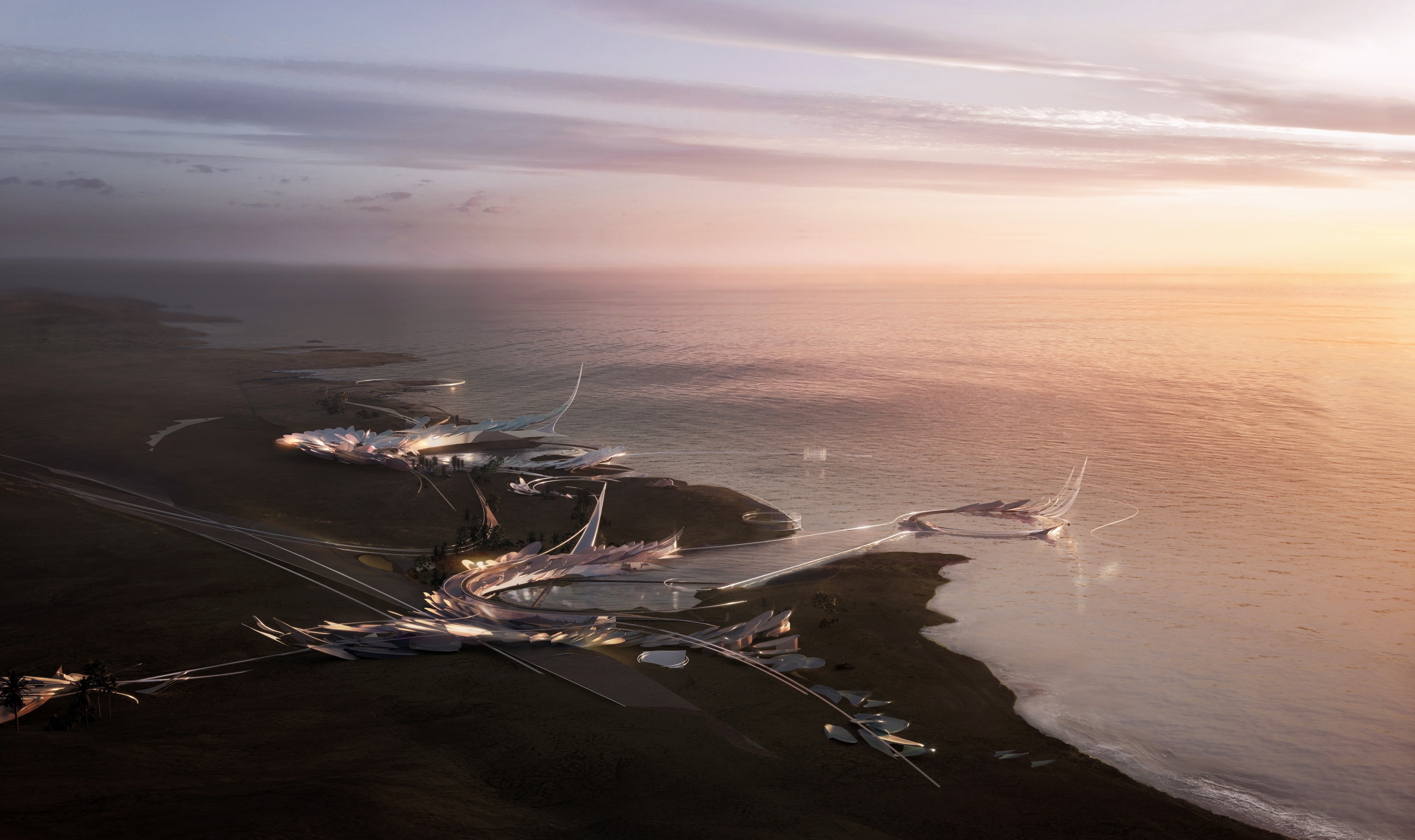 PRE-CONCEPT design Awakening of the Desert unfolds as a dynamic choreography of loops, scoops, and feather‑like architectural elements drifting across the dunes. Its language of leaves, drapes, glass, and crystalline enclosures moves with the desert winds—structures that breathe, shimmer, and animate the landscape. Around the lagoons the architecture gathers, then dissolves seamlessly into the sand, remaining light, almost fragile, and performing beyond its program. Glass reflections, shifting shades, and the sparkle of water merge into an ever‑changing symphonic loop at the bay’s edge. This place becomes a starting point—a symbolic gateway where congealment and dissolvement flow along the coast in a continuous gesture. The movement seems infinite, stretching into the horizon, leaving behind only traces: a glimmer on the sea, a shimmer across the sand. EDIT - Archviz