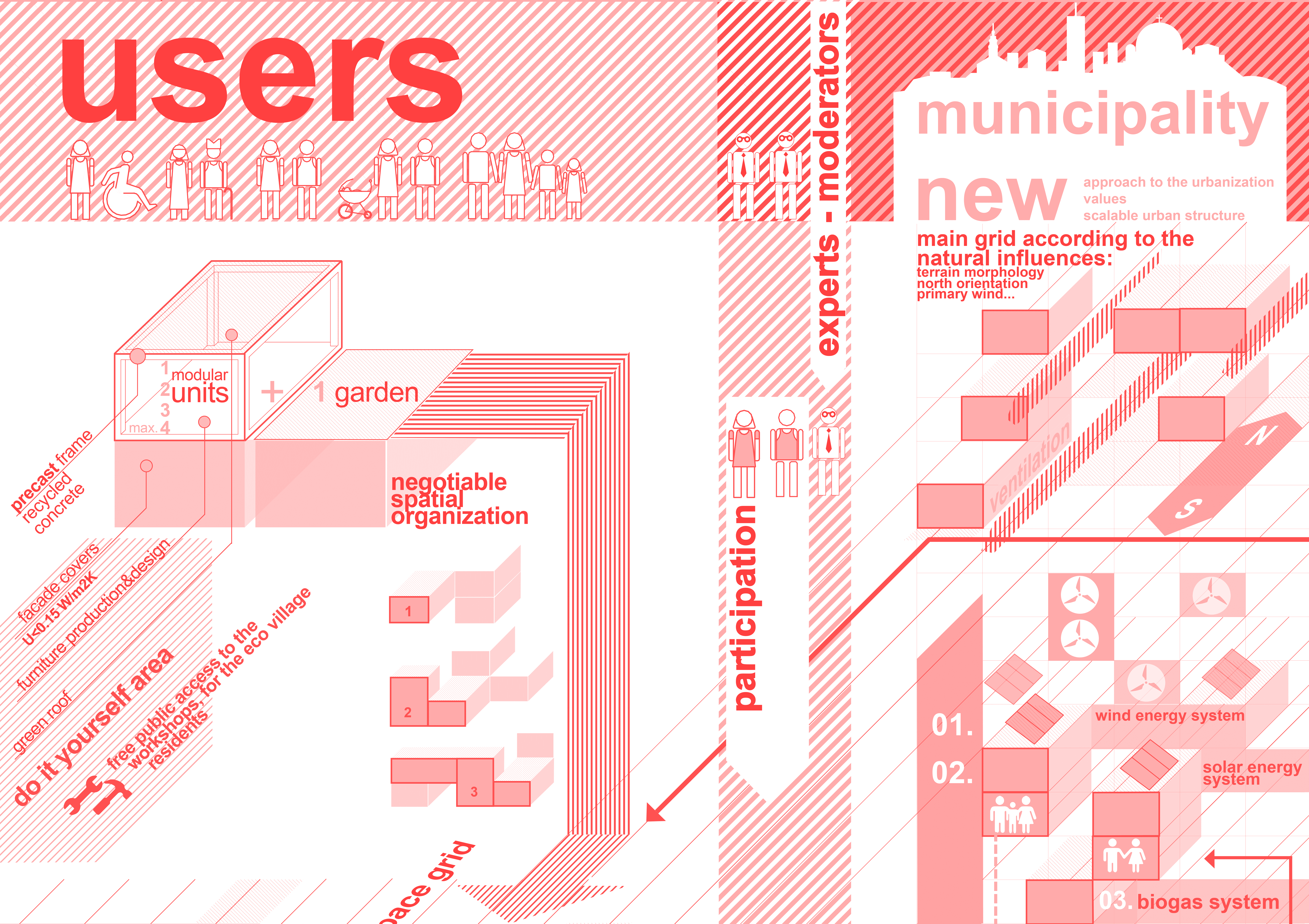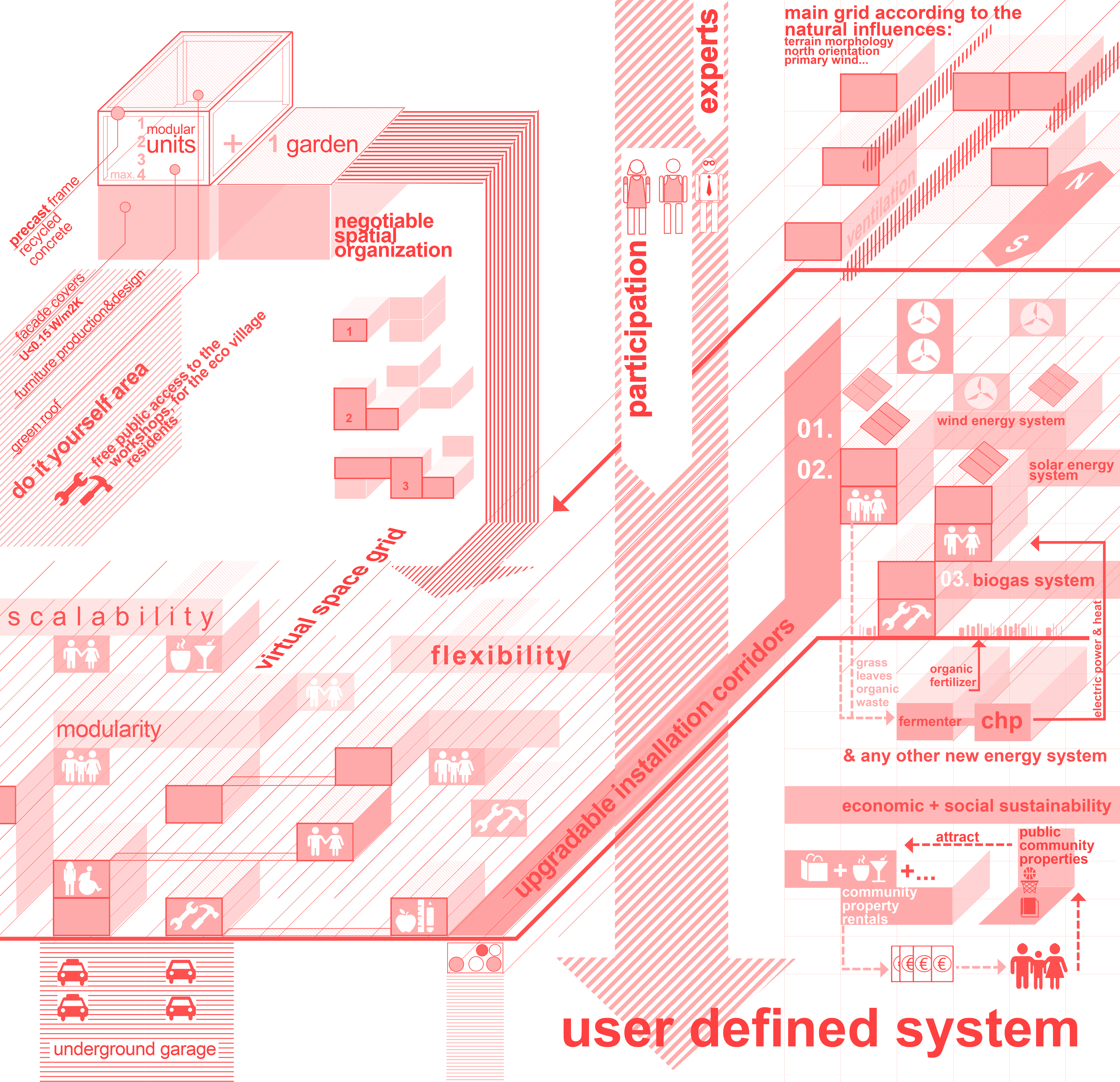 This project explores how to create an eco-community where community itself drives contemporary urban life. Rather than treating community as a result of development, we embed it directly into the building process, with the city acting as a platform that enables participation and collaboration. Dialogue and inclusion form a new kind of infrastructure — one that supports active engagement while allowing residents to shape and personalize their spaces. The model aligns the city’s goals of sustainability, affordability, and quality with residents’ everyday needs and identities. We expand the idea of infrastructure beyond construction systems to include collective ownership and shared management as foundations for long-term social cohesion. Flexibility moves beyond adaptable housing units to encompass flexible social and economic relationships — spaces that can expand, contract, and evolve over time in response to context and community dynamics. Community is not an addition to architecture — it is its framework.