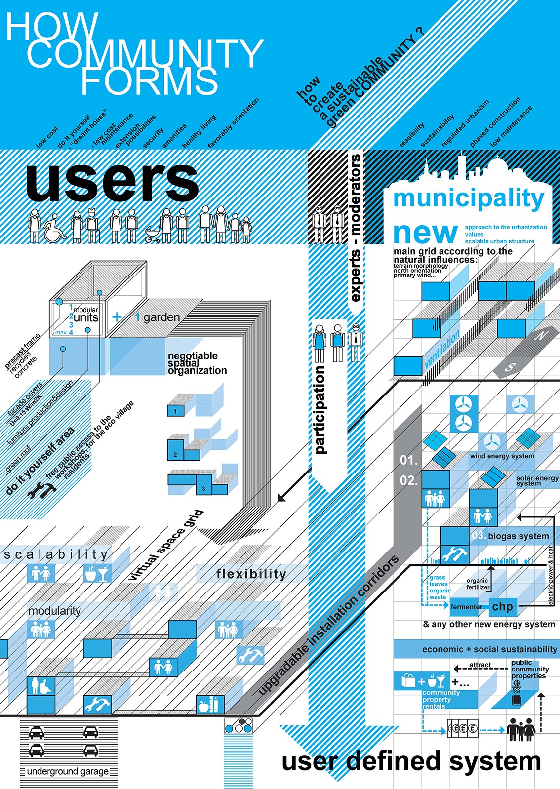 This project explores how to create an eco-community where community itself drives contemporary urban life. Rather than treating community as a result of development, we embed it directly into the building process, with the city acting as a platform that enables participation and collaboration. Dialogue and inclusion form a new kind of infrastructure - one that supports active engagement while allowing residents to shape and personalize their spaces. The model aligns the city’s goals of sustainability, affordability, and quality with residents’ everyday needs and identities. We expand the idea of infrastructure beyond construction systems to include collective ownership and shared management as foundations for long-term social cohesion. Flexibility moves beyond adaptable housing units to encompass flexible social and economic relationships — spaces that can expand, contract, and evolve over time in response to context and community dynamics. Community is not an addition to architecture - it is framework.