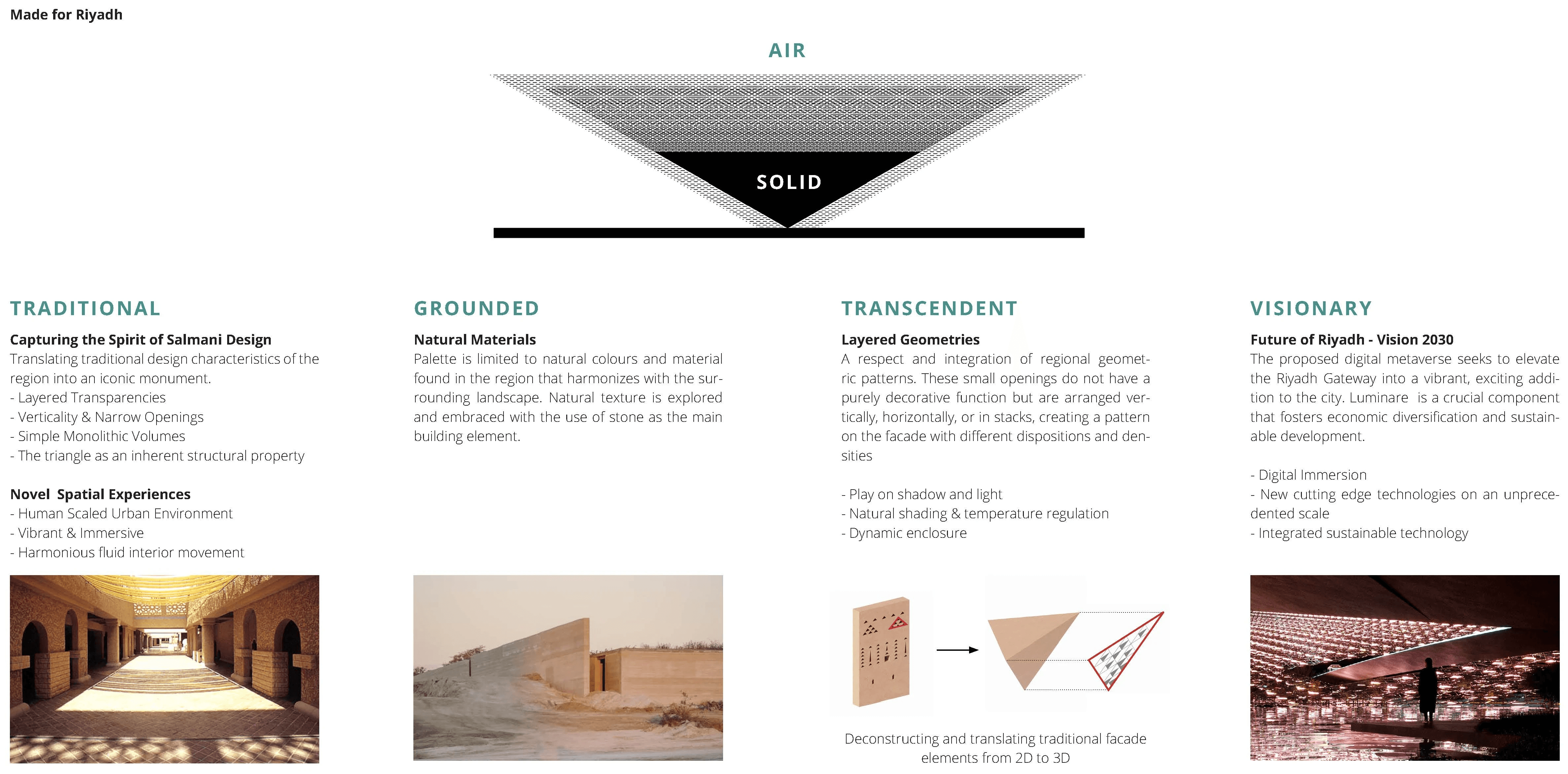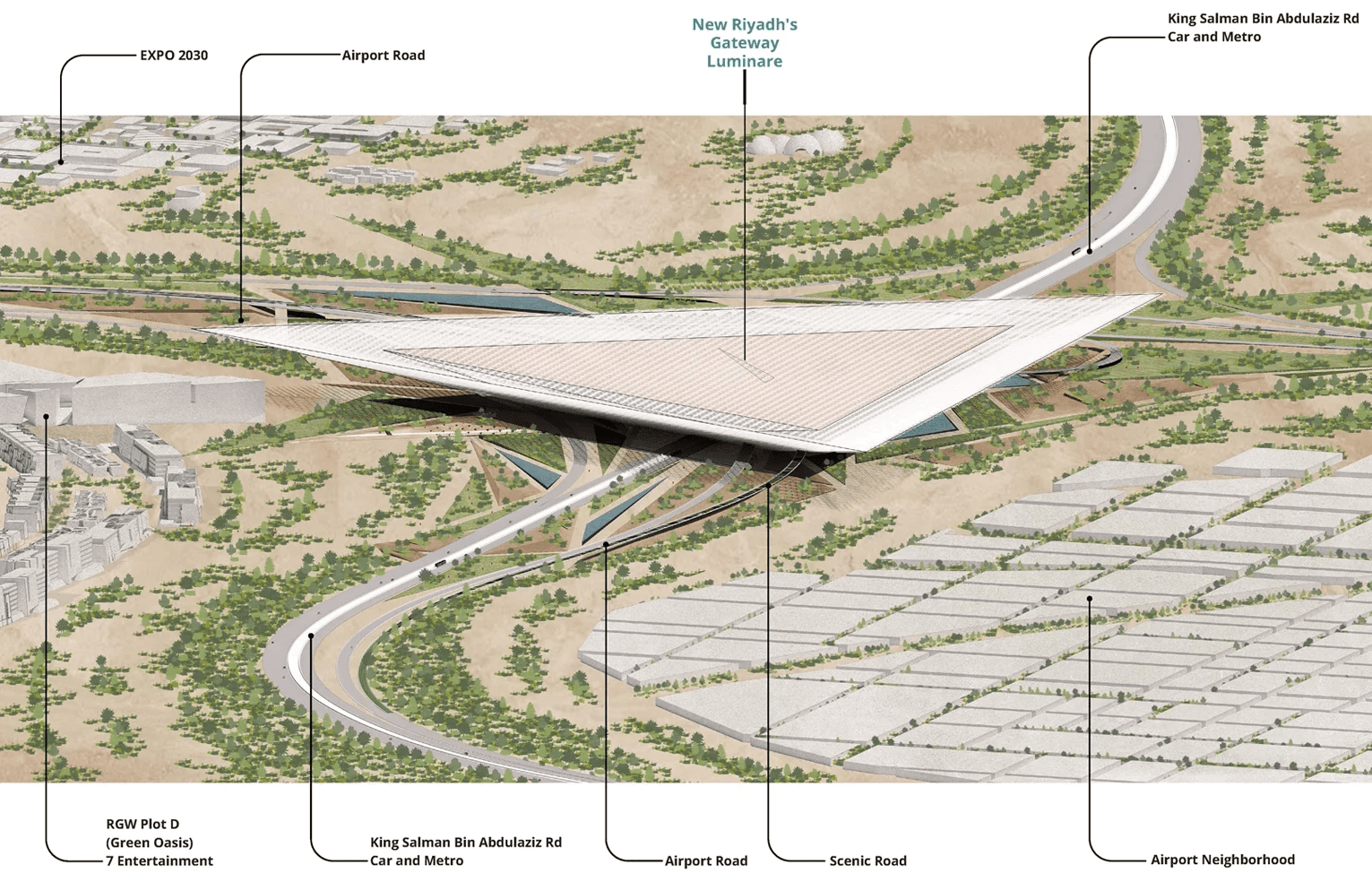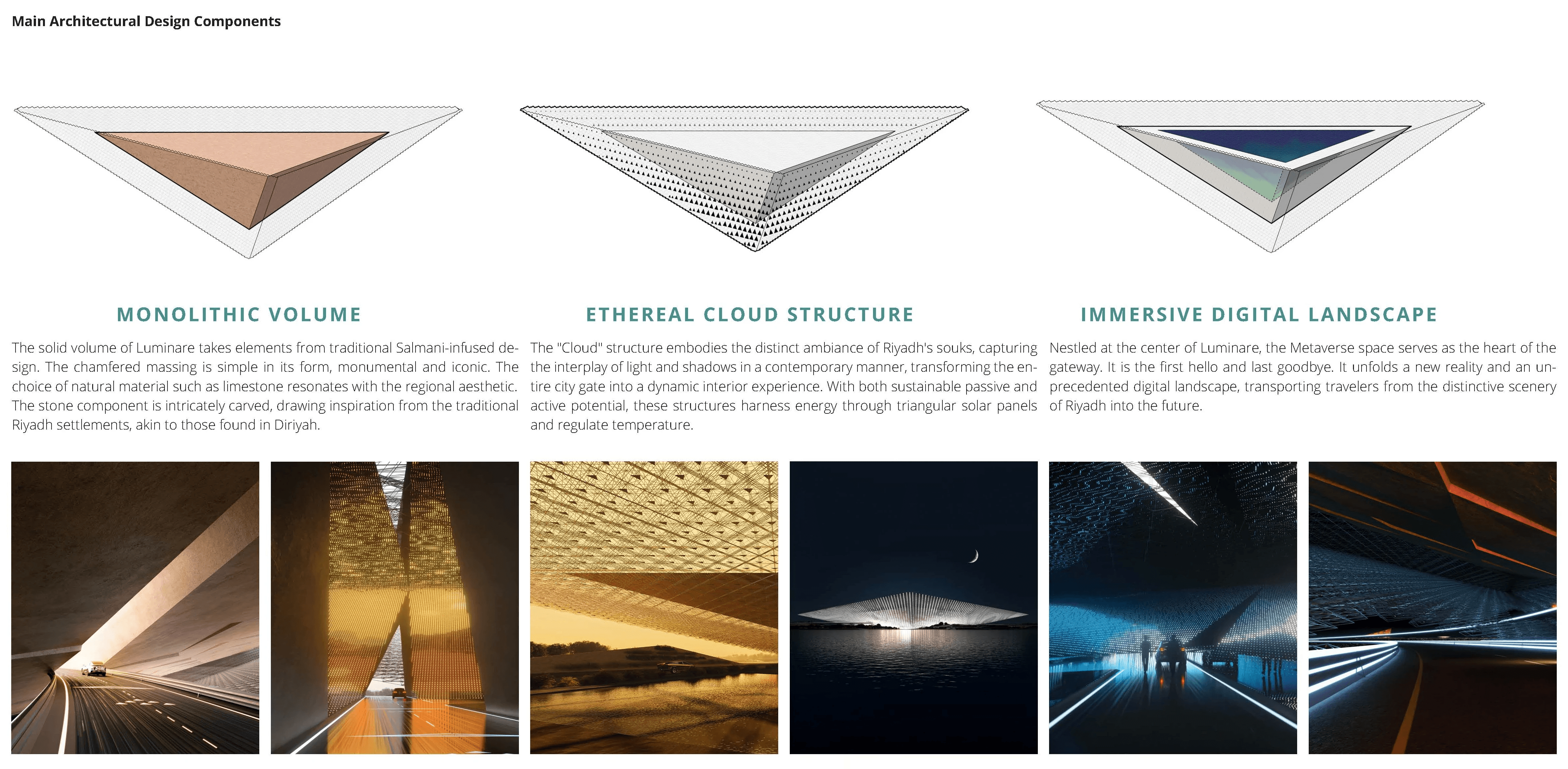 Pre-Concept Gateway Vision Riyadh Gateway Vision Luminare, a beacon in Riyadh's evolution, blends tradition with innovation, serving as the primary gateway. It enhances arrivals, symbolizing Riyadh's commitment to progress and a dynamic future. Symbol of Progress: Luminare is an iconic symbol, embodying Riyadh's commitment to innovation. Tradition Meets Modernity: Deeply rooted in Riyadh's identity colors, materials and architecture, Luminare harmoniously blends tradition with forward-thinking design and technology. Shifting Perceptions: Beyond a gateway, Luminare challenges perceptions, encouraging visitors to see Riyadh anew. Essential Experience: Internally, Luminare offers an essential, curated space connecting the present with limitless possibilities. Sustainable Design: Aligned with the Green Riyadh Initiative, Luminare incorporates eco-friendly features. Catalyst for Transformation: Luminare aims to be a transformative catalyst, inspiring future projects and contributing to continuous evolution of the city. Sub-cunsultants: Saraiva + Associados (S+A) - Urban Planning Phasing Strategies LJ Group - Public Realm & Landscape Design GEG Engineering - Mobility, Sustainability & SMART, Technical Infrastructure Bitscapes & Atchain - Archviz
