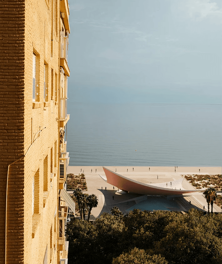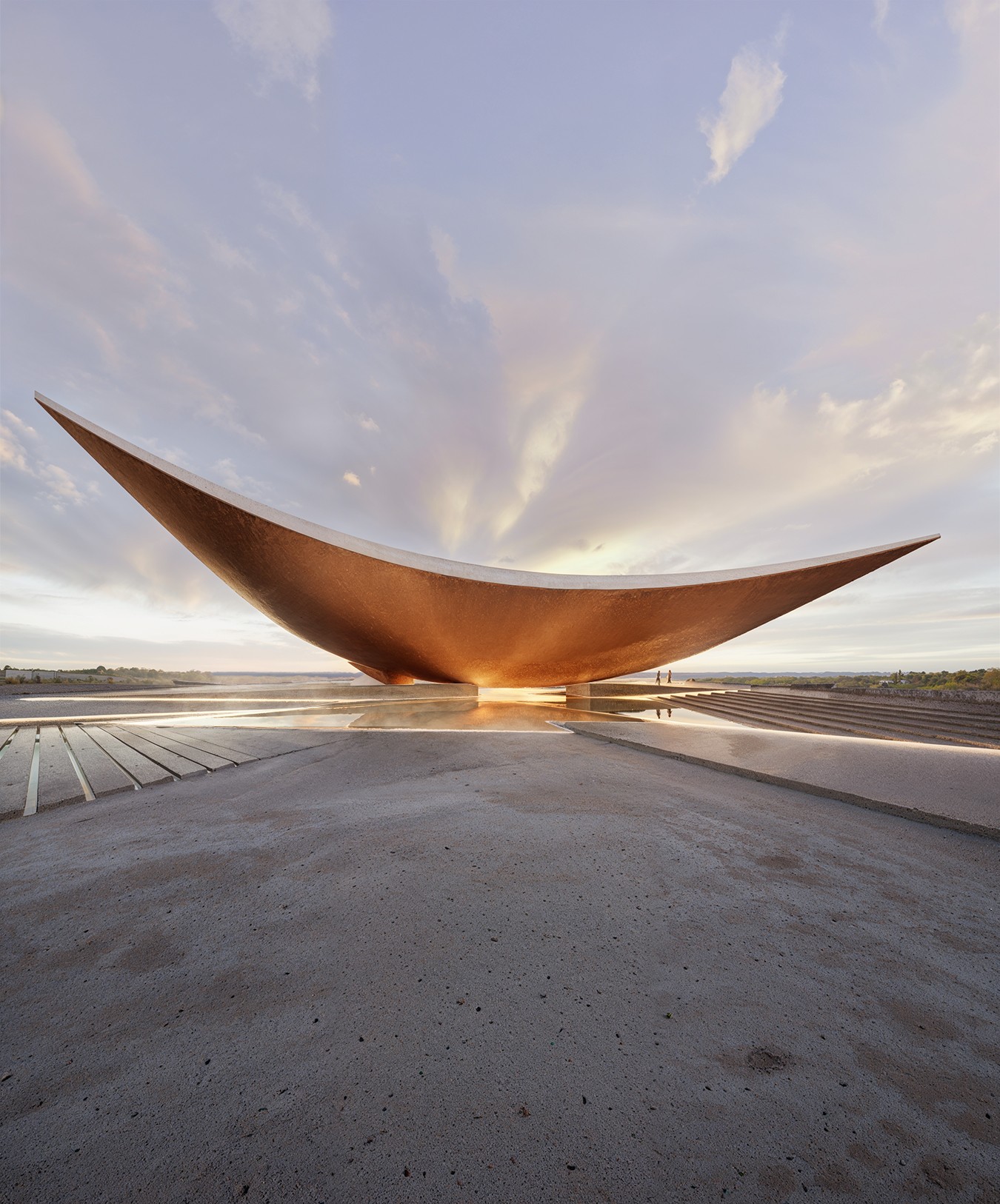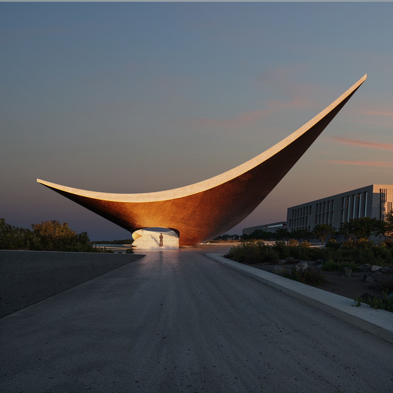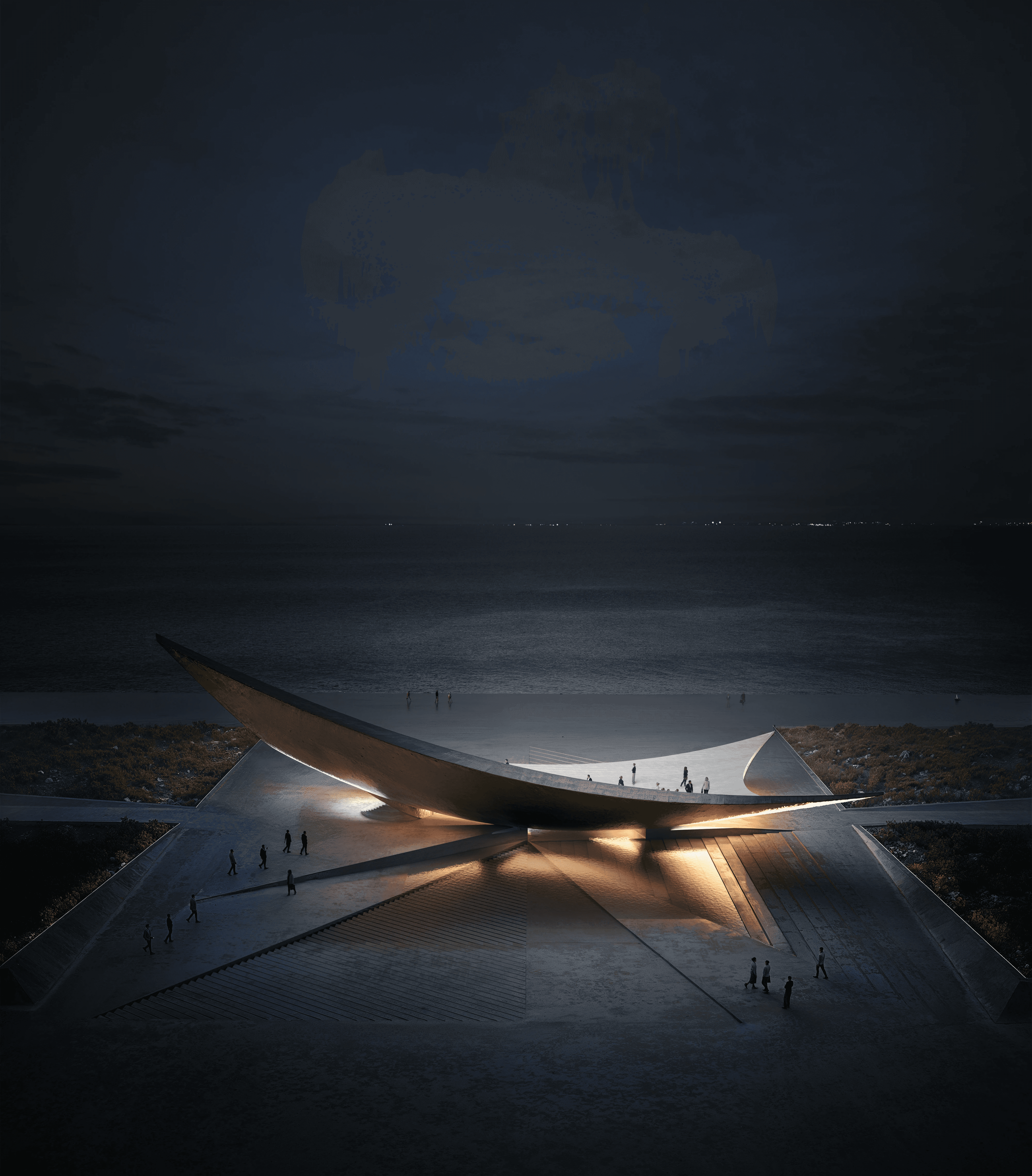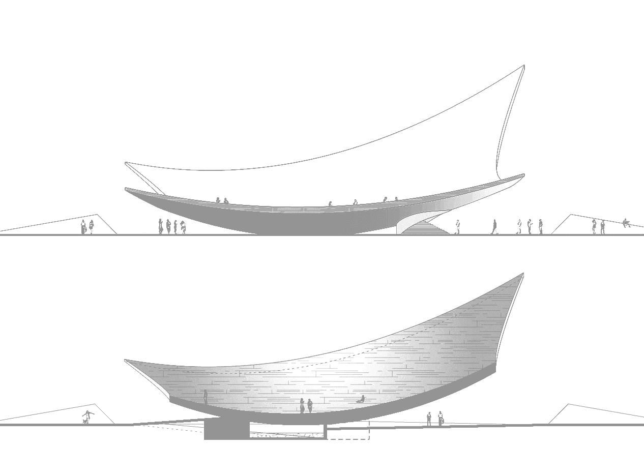 Competition Entry | Shortlisted project Project embodies this vision as both a symbolic and functional landmark. Inspired by a piece of cloth, the structure rises lightly toward the sky while remaining grounded. It is not conceived as a monument, but as a usable artifact; creating shade and public space beneath it, where water becomes a central element. From the sea, it appears as a shimmering, floating form that invites curiosity and exploration. As the sun sets, the elevated structure transforms into a majlis at its core, a sheltered communal space that opens toward the sea and night sky, offering protection from the city while emphasizing openness and connection. Its simple yet expressive form recalls nomadic tents, boat hulls, and the crescent moon. It celebrates gathering and frames water as a life-giving presence, creating a destination that belongs equally to the natural and urban realms; a functional landmark within the public space. The proposal is organized across two levels. The upper level, embedded within the sculptural form, provides an intimate, contemplative space with direct views toward the Arabian Gulf. The ground level forms a more open and accessible public realm, structured within the deep shade of the elevated mass, balancing exposure and enclosure, collectivity and retreat. Sub-consultants: EDIT - Archviz