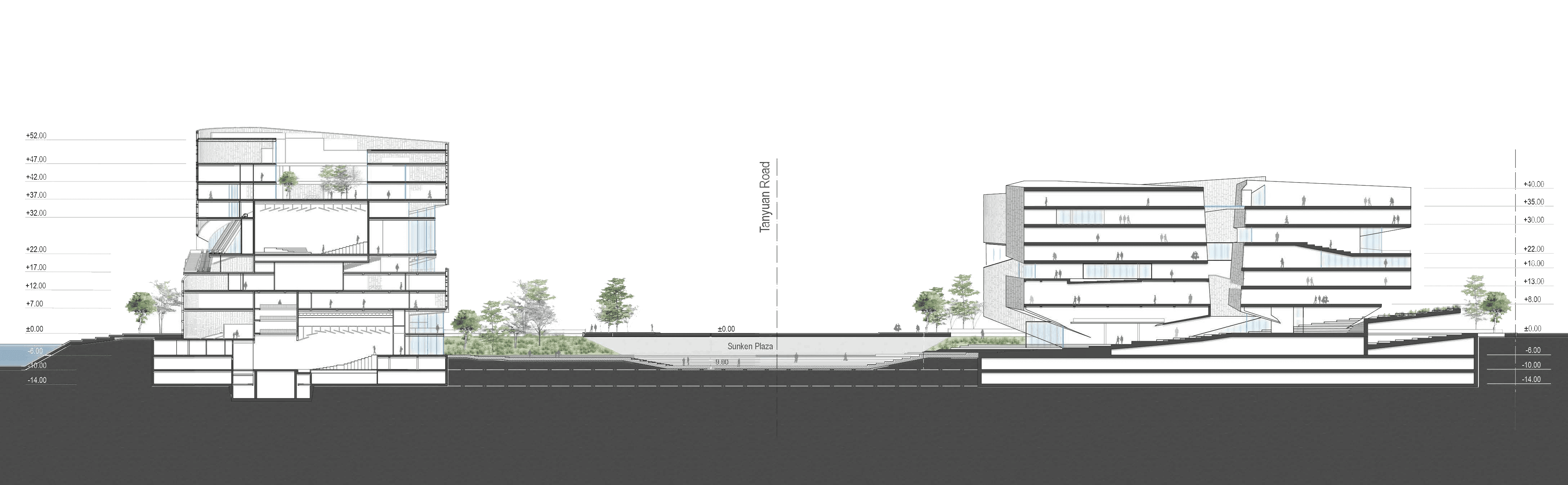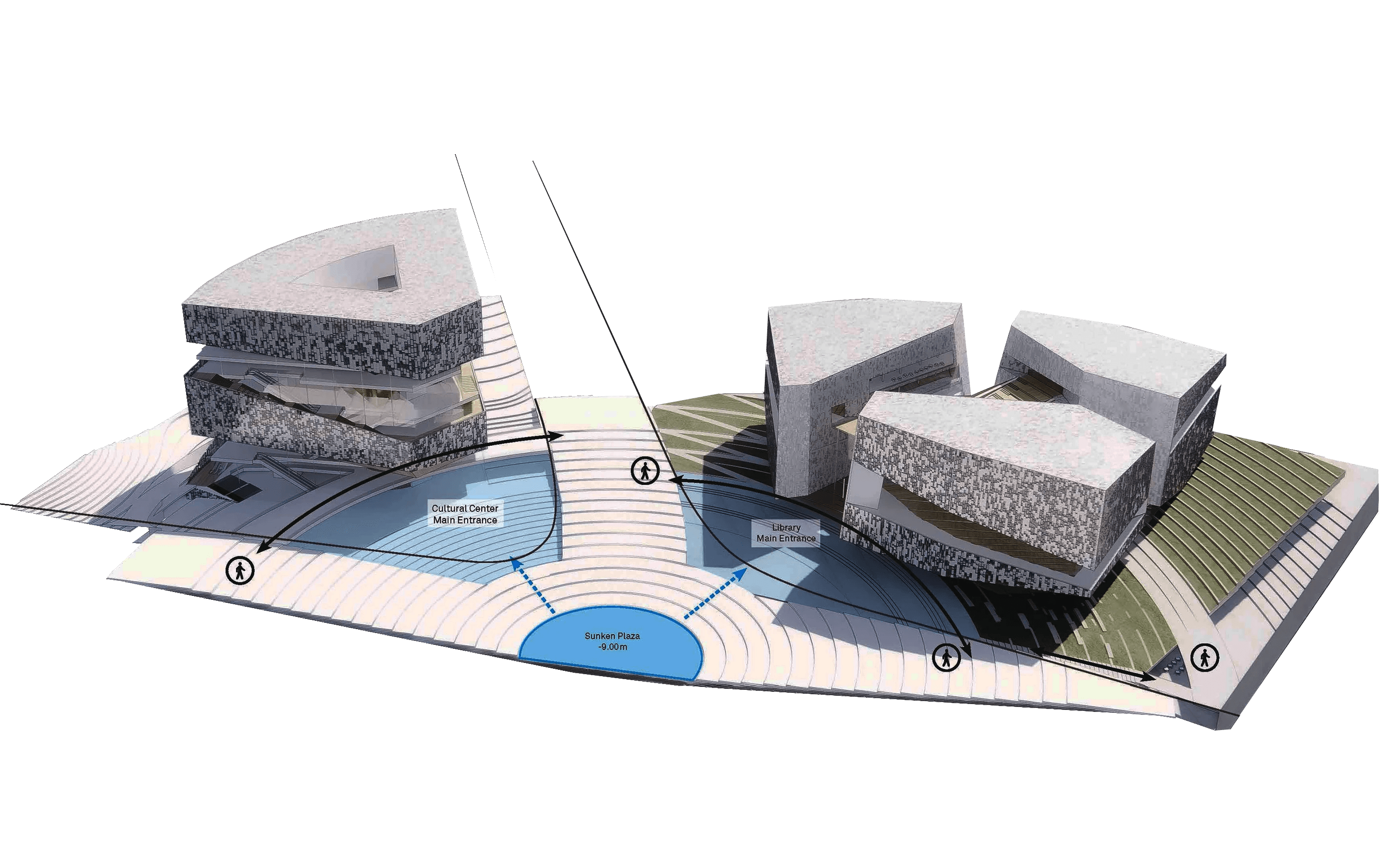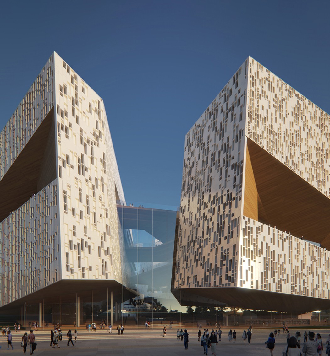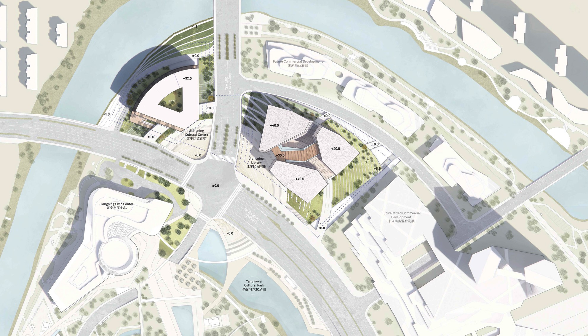 Competition Entry | First Prize Hills punctuate the fabric of Nanjing with areas where the public can access nature, relax, orientate themselves and appreciate the past. The library and cultural center are located on a new distorted landscape that weaves into the existing cultural area containing the Civic Center and Park. The landscape rises by the library and cultural center so that users can familiarize themselves with the city before entering the respective buildings. A Library is a place of contemplation and repose. A Cultural Centre is a place of dynamic interaction with the city. One is introverted, the other extrovert however both release their respective sites to the most important part of public buildings, the public. Our proposal for the Jiangning Library and the Cultural Center takes inspiration from Nanjing’s cultural heritage of being a stone city. The volumnes are expressed in such way showing the duality of the two differnt programs: Library is introverted and the Cultural Centre extroverited. The articulation of the stone facade resembles the richness of stonework, it will be covered with recesses and protrusions emphasising the effects of light and show on the surface. When illuminated by the sunlight, it creats aniated displays of light and shadow. In collaborations with SNØHETTA, LDI: ECADI
