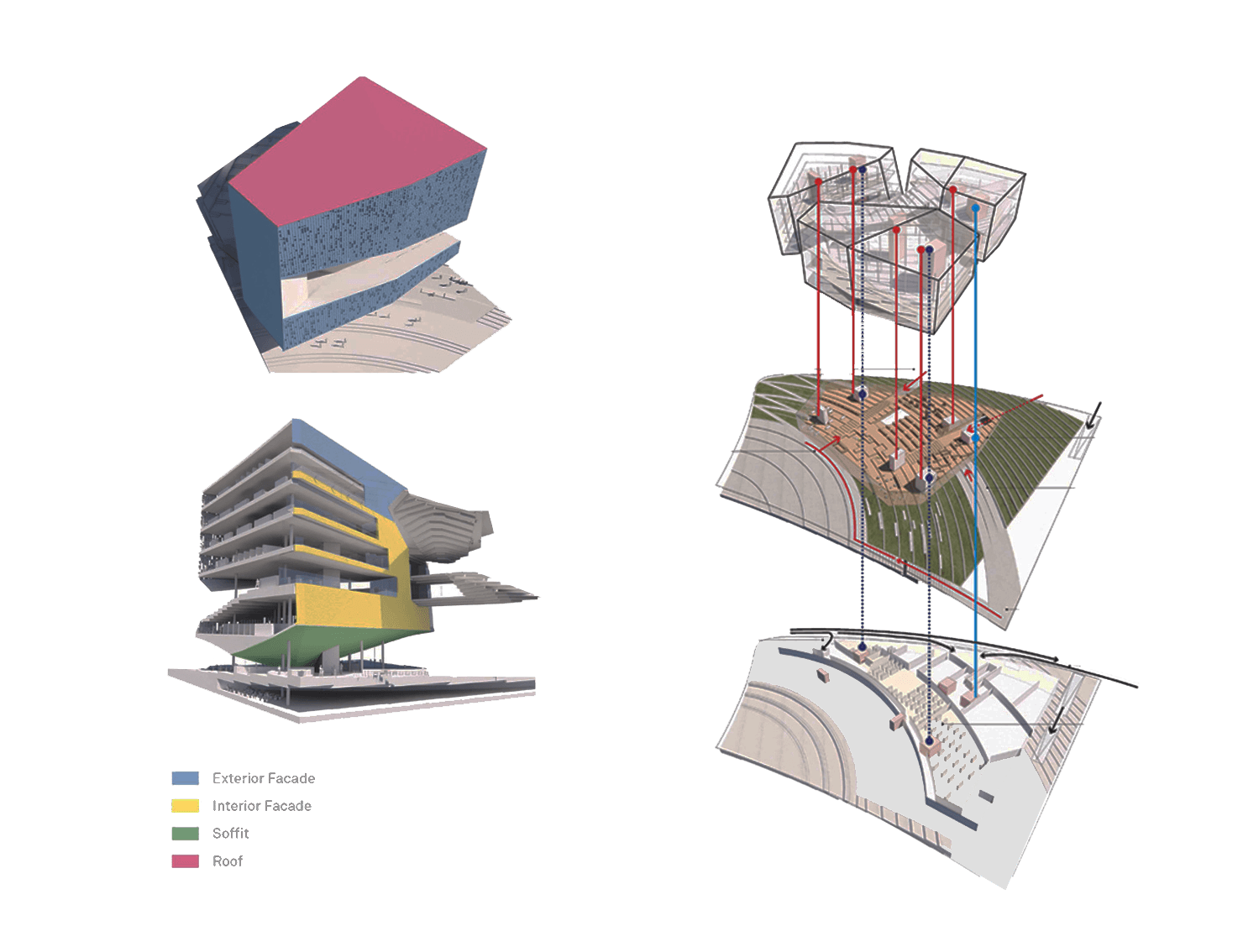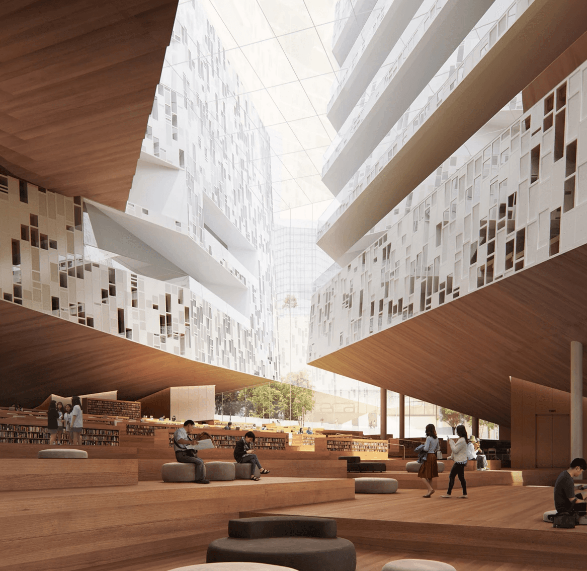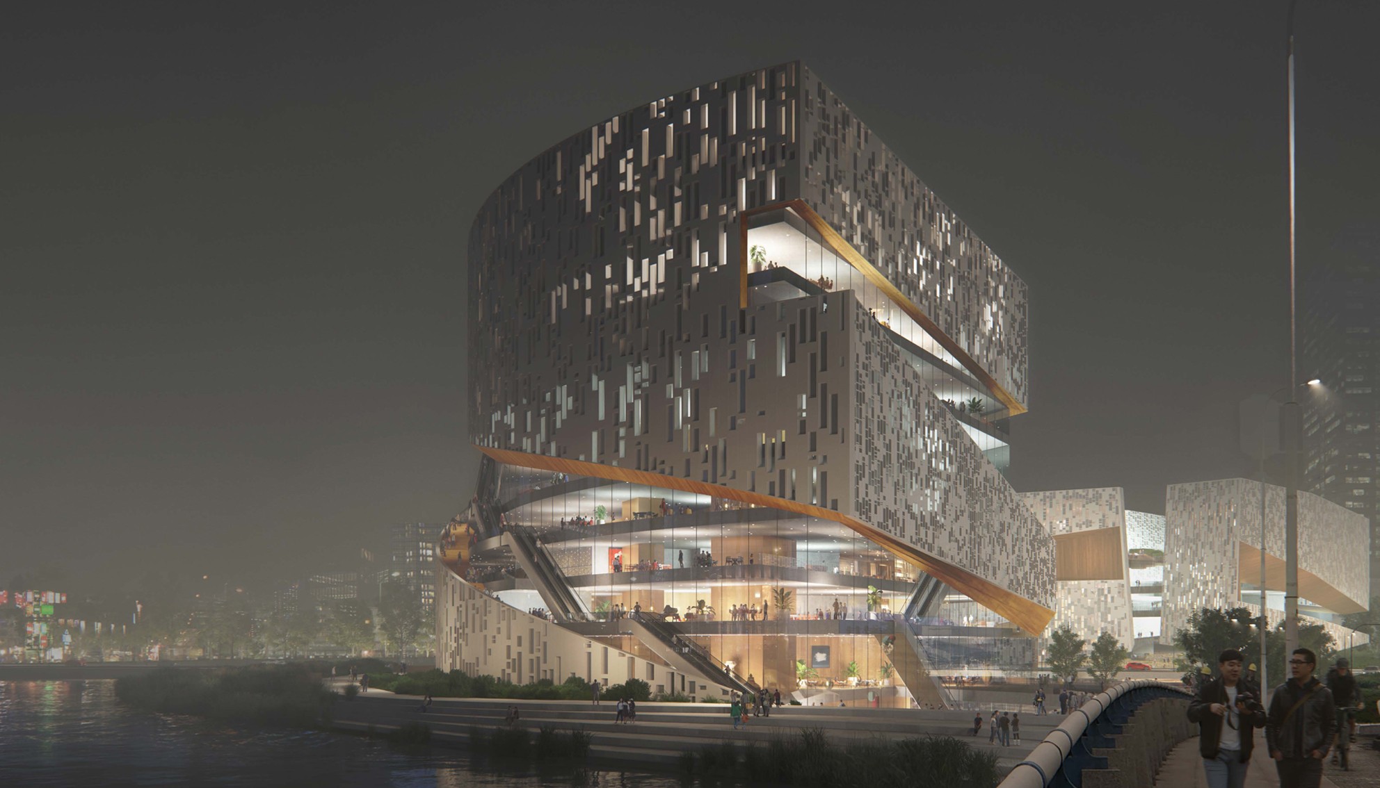 Competition Entry | First Prize Hills punctuate the fabric of Nanjing with areas where the public can access nature, relax, orientate themselves and appreciate the past. The library and cultural center are located on a new distorted landscape that weaves into the existing cultural area containing the Civic Center and Park. The landscape rises by the library and cultural center so that users can familiarize themselves with the city before entering the respective buildings. A Library is a place of contemplation and repose. A Cultural Centre is a place of dynamic interaction with the city. One is introverted, the other extrovert however both release their respective sites to the most important part of public buildings, the public. Our proposal for the Jiangning Library and the Cultural Center takes inspiration from Nanjing’s cultural heritage of being a stone city. The volumnes are expressed in such way showing the duality of the two differnt programs: Library is introverted and the Cultural Centre extroverited. The articulation of the stone facade resembles the richness of stonework, it will be covered with recesses and protrusions emphasising the effects of light and show on the surface. When illuminated by the sunlight, it creats aniated displays of light and shadow. In collaborations with SNØHETTA, LDI: ECADI