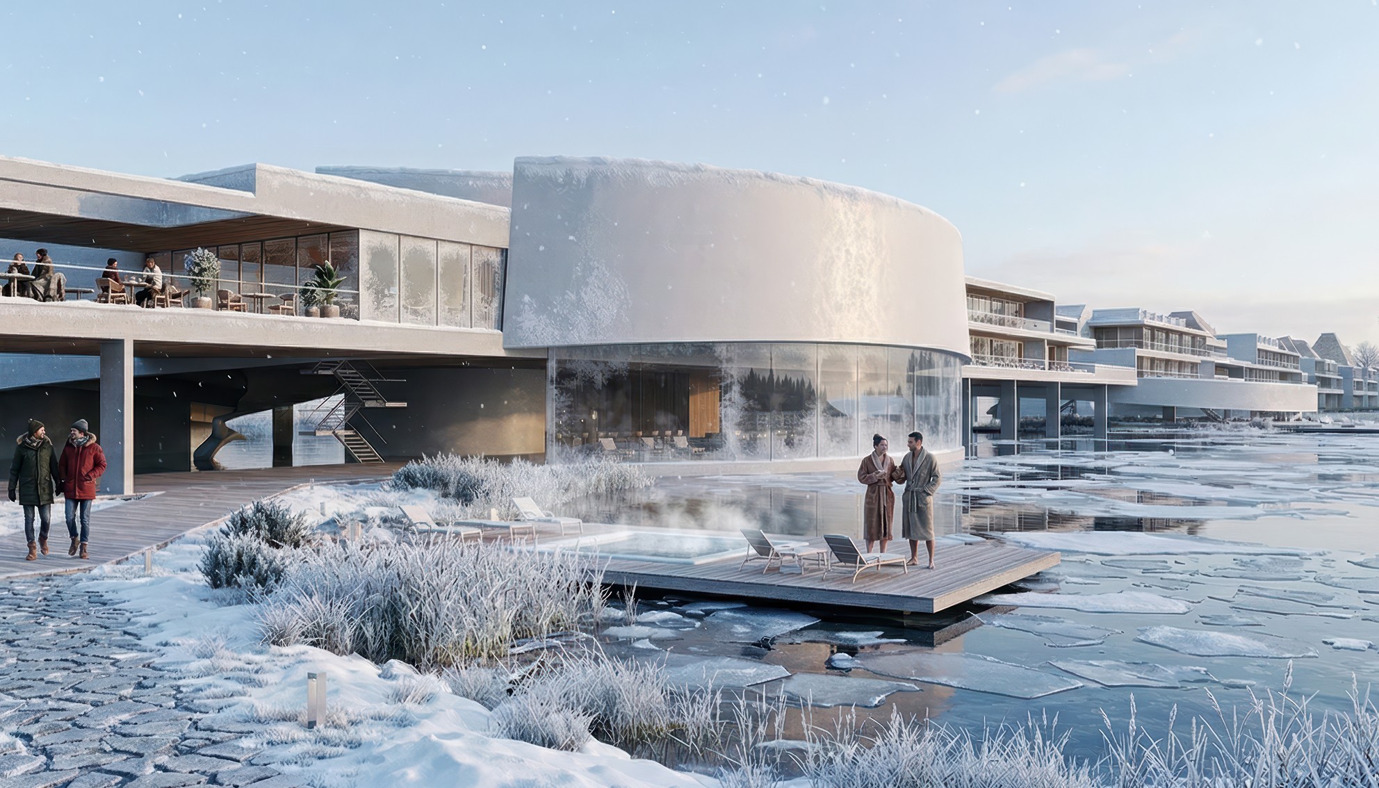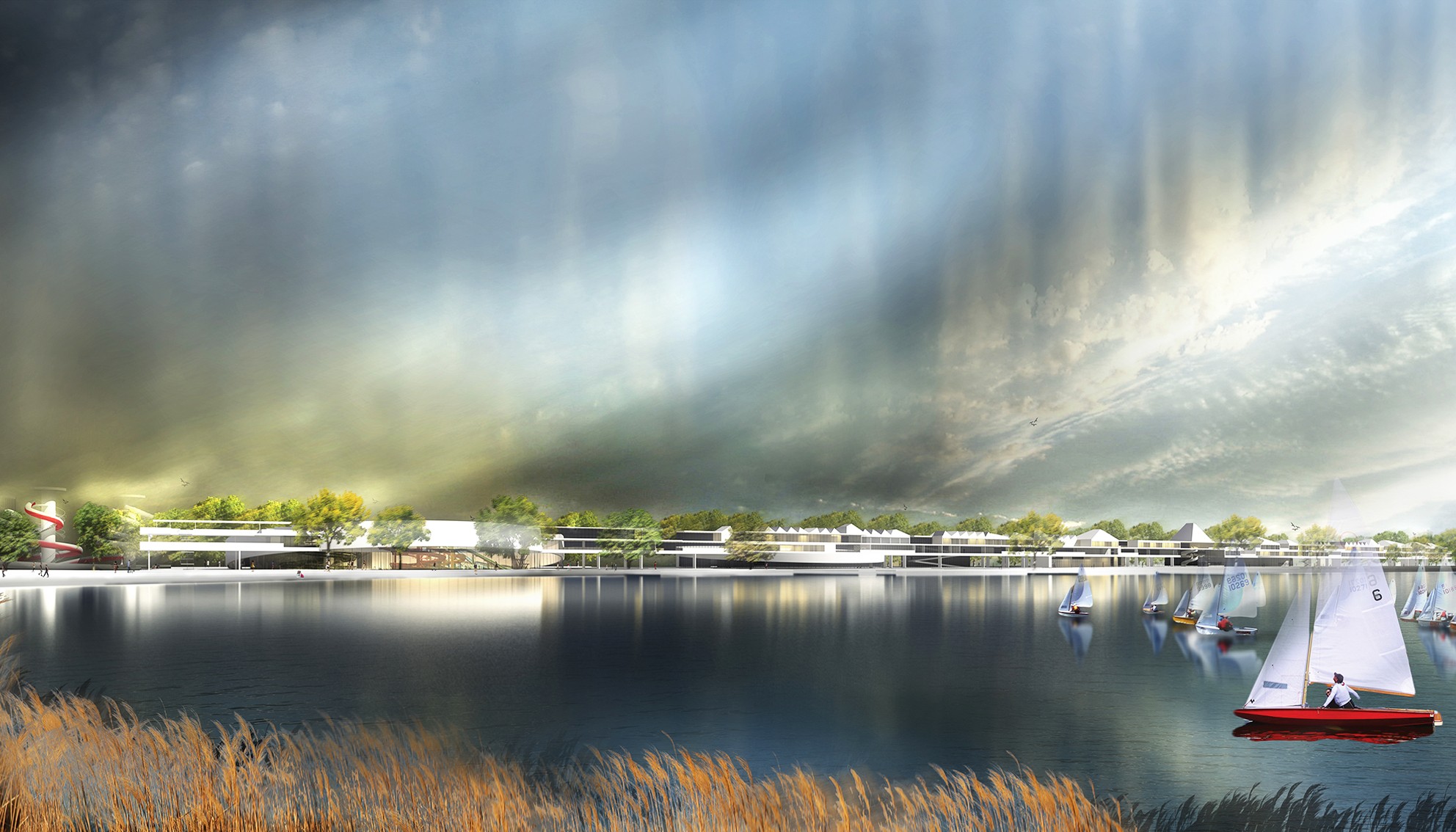 Competition Entry | Third prize Design for a hotel and SPA Complex in a flat land environment between two lakes. Rooted in the logic of unit architecture, the street-like object rests on a transparent ground floor so that the visual contact between the lakes can be retained. The ‘levitating’ architecture of the remaining two floors functions as a landmark, a gravity line on the horizon.