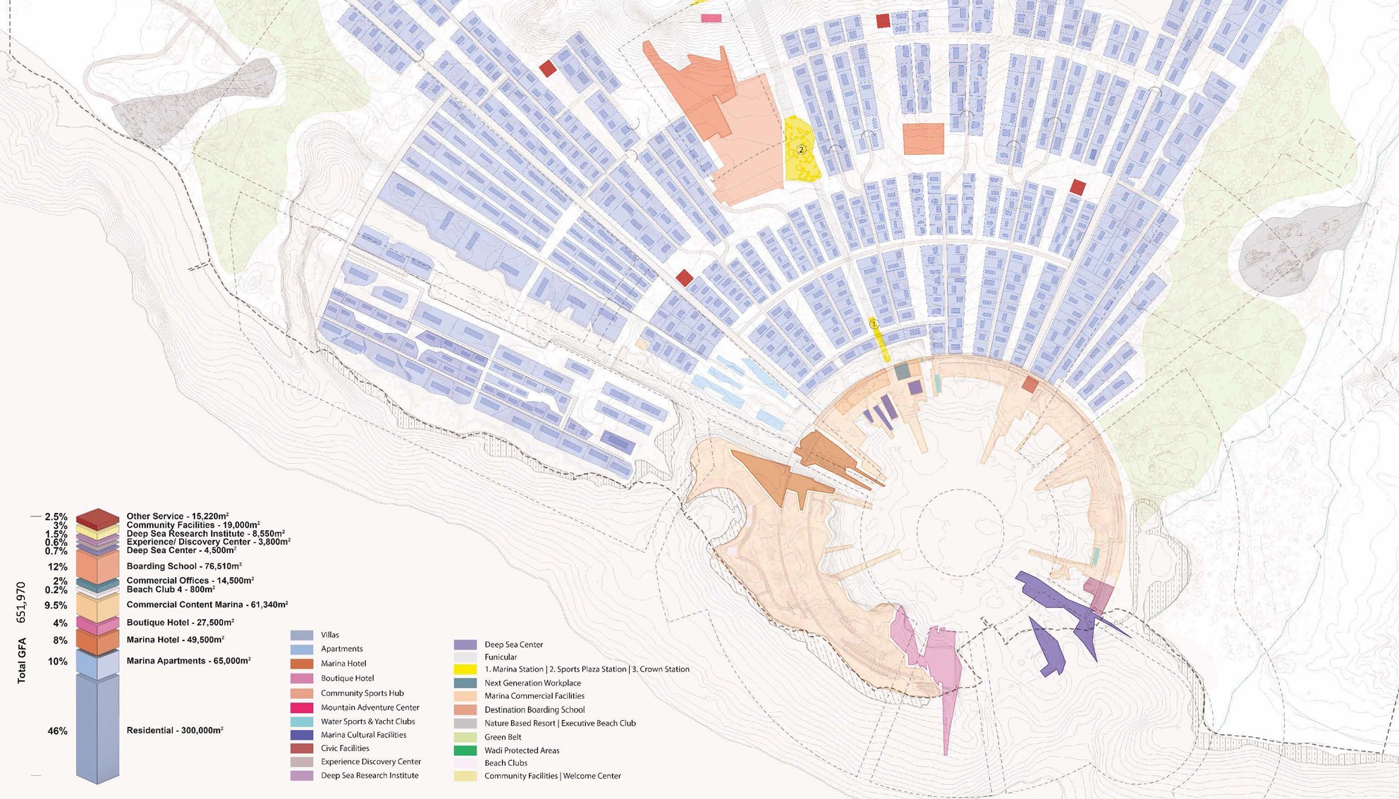 PRE-CONCEPT Masterplan MAGNA Designing the new image of Magna Waterfront will revolve around the center area developed as compact urban fabric, dissolving gradually. A radial distribution of the program separates the vibrant core fulfilled with public functions around the Marina from the private and exclusive villas. Using terrain topography and the stepping method the composition provides exceptional views from every plot towards the harbor. The inner voids are introduced through Water Canals and Green Cracks penetrating the city with water and vegetation. Sub-consultants: Bollinger+Grohmann - Structural design Lj-Group - Landscape architects Redas Engineers SRL - Mobility ATM - Marine consultant Systra group-MEp Bitscapes & EDIT - Archviz ApexCost- Cost